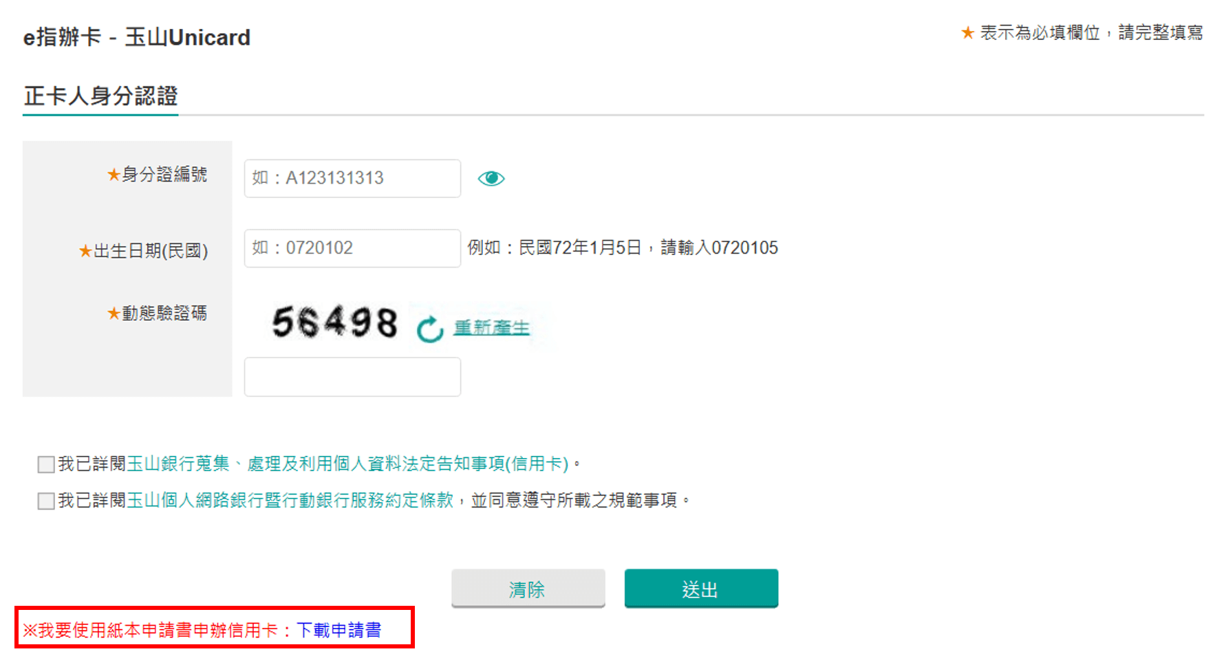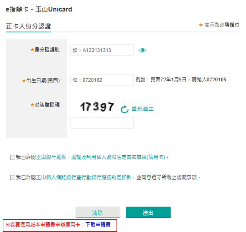 常見問題 Q1. 可以同時申辦正卡跟附卡嗎? 同時申請正附卡,請透過下載申請書填寫資料後,寄回玉山信用卡暨支付金融事業處 (地址:241460 新北市三重區中興北街42巷17弄10號)。 Q2. 如果沒有持有正卡,可以單獨申辦附卡嗎? 附卡是附屬於正卡名下發行的,因此若正卡人未持有卡片時,無法單獨申辦附卡。 Q3. 申辦附卡要年費嗎? 每張卡免年費條件不同,請於各卡片介紹頁中確認。卡片介紹頁 Q4. 如果附卡人非本行卡友或存戶,也沒有他行信用卡/他行臨櫃帳戶/自然人憑證,怎麼申辦附卡呢? 請列印辦卡頁下方之下載申請書,填寫完成後寄回玉山銀行信用卡暨支付金融事業處 (地址:241460 新北市三重區中興北街42巷17弄10號)。 Q5. 若正卡人指定附卡人額度,是否會影響同一附卡人其他張附卡額度? 相同正卡人名下同一附卡人之所有附卡均共用指定額度。 Q6. 為什麼點了申辦附卡連結出現失效畫面? 申辦附卡連結為24小時內有效,若出現失效畫面,需請正卡人重新產製連結。 Q7. 哪裡可以上傳附卡人身分證? 附卡申請完成後,可透過完成頁之上傳資料按鈕或是透過信用卡補件平台上傳身分證。