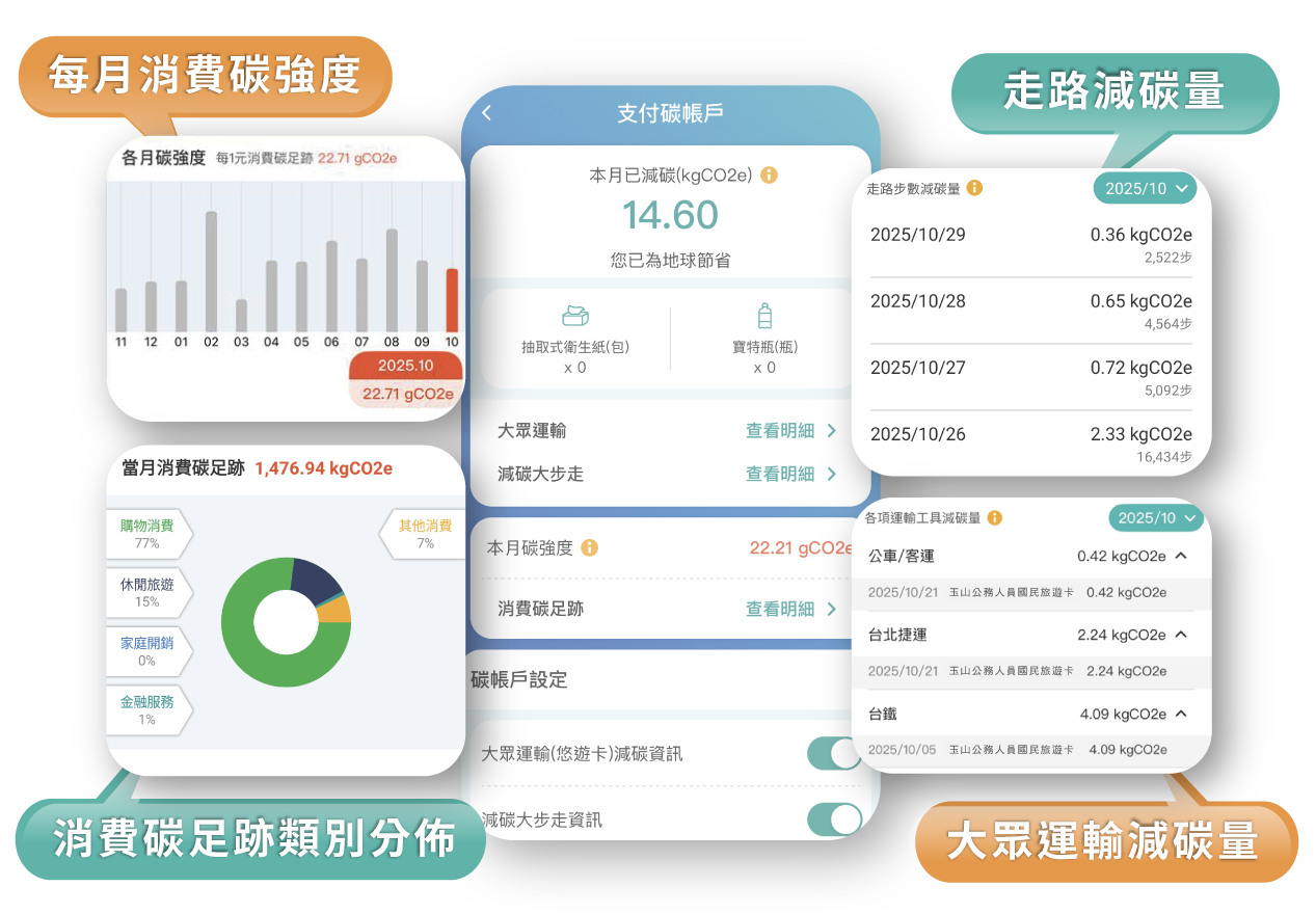 提供每月消費碳強度及購物、旅遊、交通等七大類別的消費碳足跡,隨時檢視碳足跡分佈狀況,減碳行動即刻開始,如:搭乘大眾運輸工具、選擇使用在地食材的店家消費,讓每次消費選擇與環境友善更靠近。