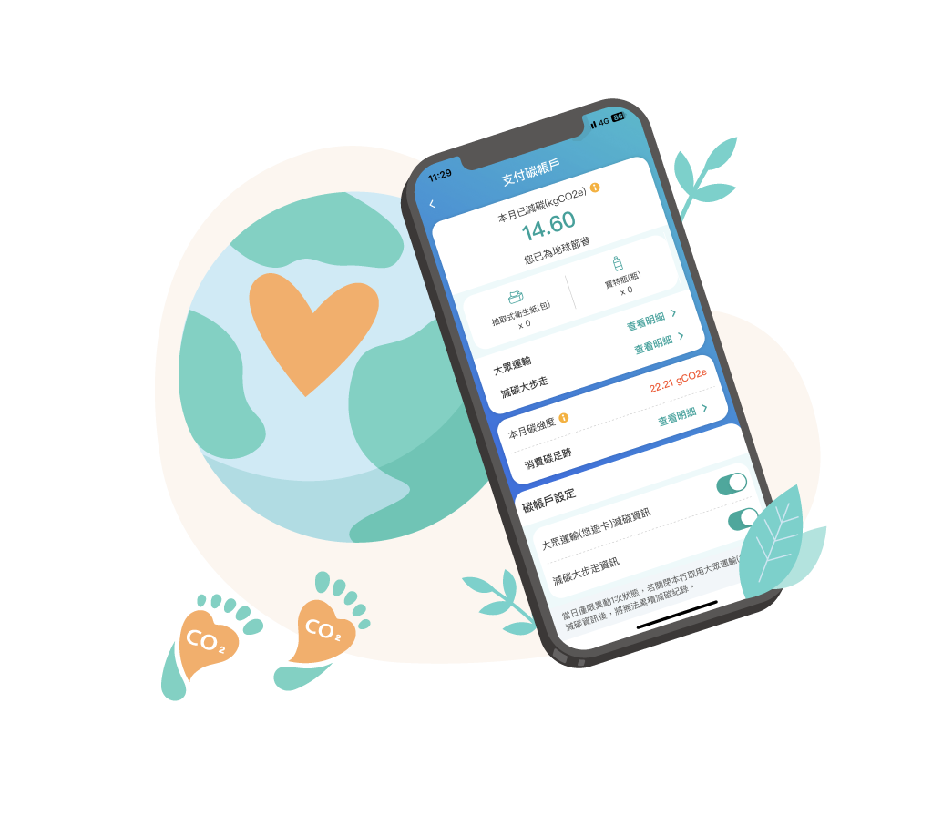 開啟減碳大步走功能,將您的每日步數換算為減碳成果,健康、減碳,一舉兩得!
