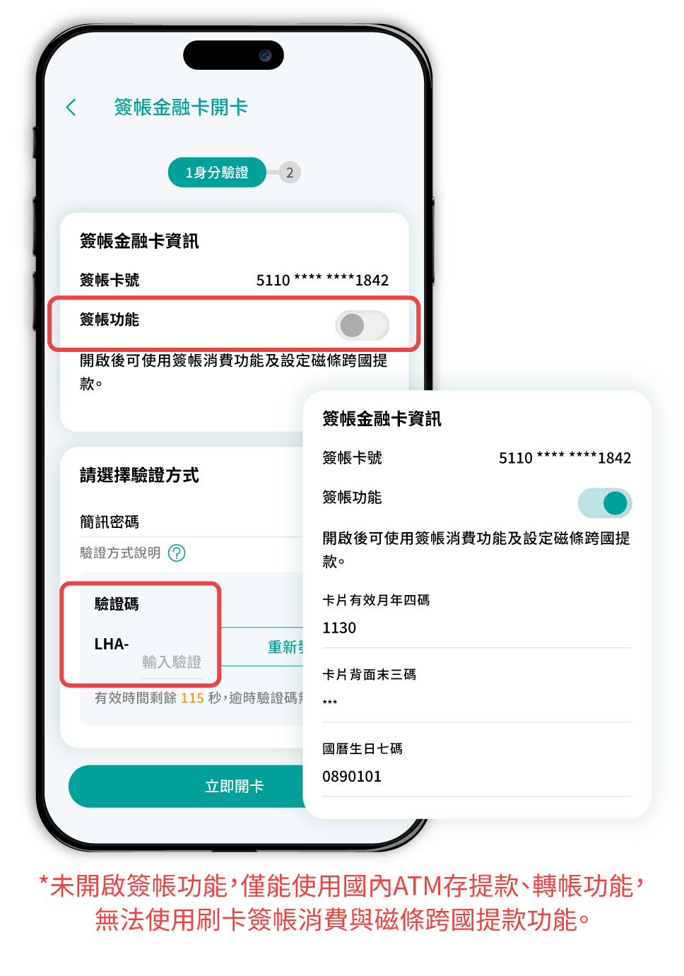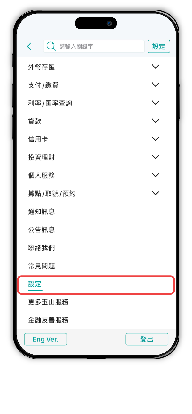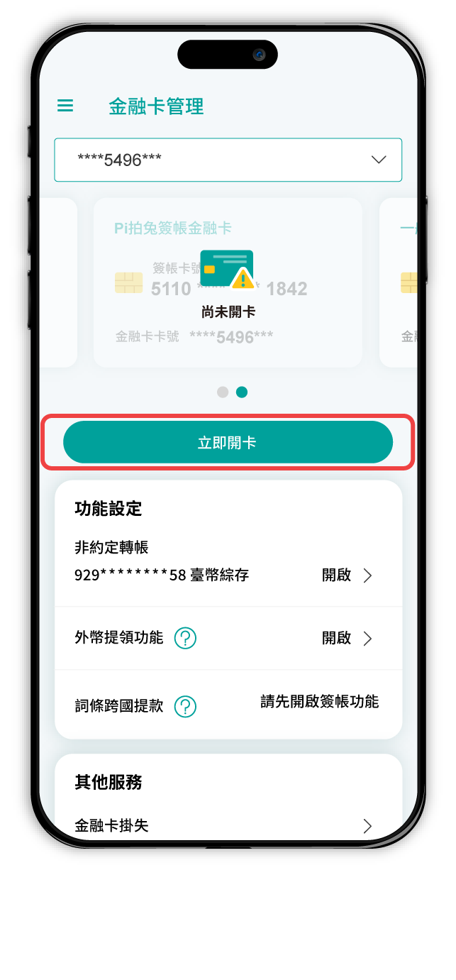 您為數位帳戶新開戶 以下畫面僅供示意,實際畫面以玉山行動銀行App為準 下載「玉山行動銀行」並登入玉山行動銀行App 於首頁點選左上方功能進入設定 點選「金融卡管理」 選擇相應卡片並點選「立即開卡」 選擇是否開啟簽帳功能並進行簡訊密碼驗證 開卡成功,透過「簡訊」領取金融卡初始密碼 盡速至鄰近分行ATM變更金融卡密碼