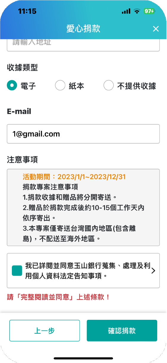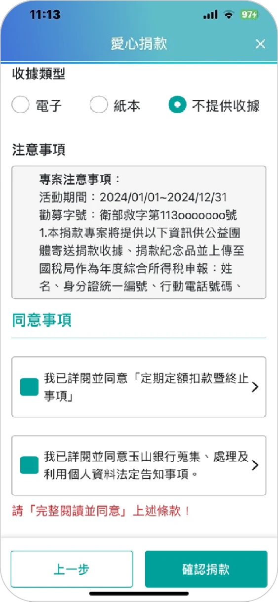 點選確認捐款❤小提醒:請閱讀並同意捐款專案「注意事項」、「個人資料法定告知事項」