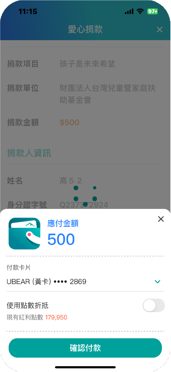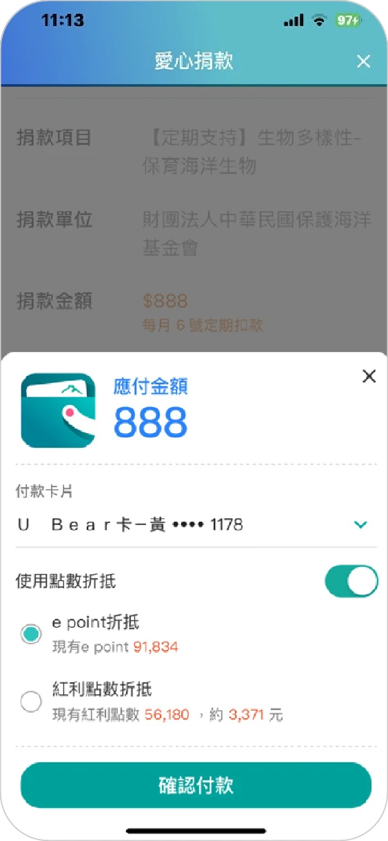 ❤小提醒:請確認捐款資訊並選取「付款卡片」、是否「使用點數折抵」
