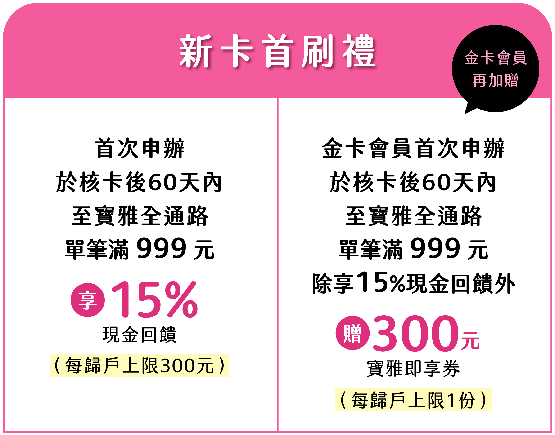 - 限首次申辦玉山寶雅聯名卡之正卡參加 (指歸戶內從未持有寶雅聯名卡者,且不含升等或加辦),並於2026/1/1~2026/6/30期間申辦且核卡成功,且於核卡後60天內至寶雅全通路首刷單筆滿999元 (含) 以上,方符合資格,每歸戶回饋上限300元。