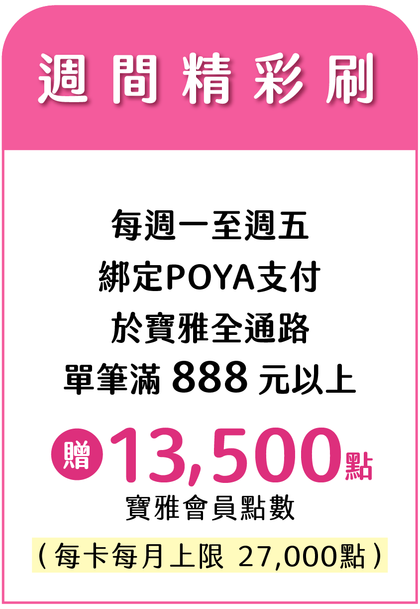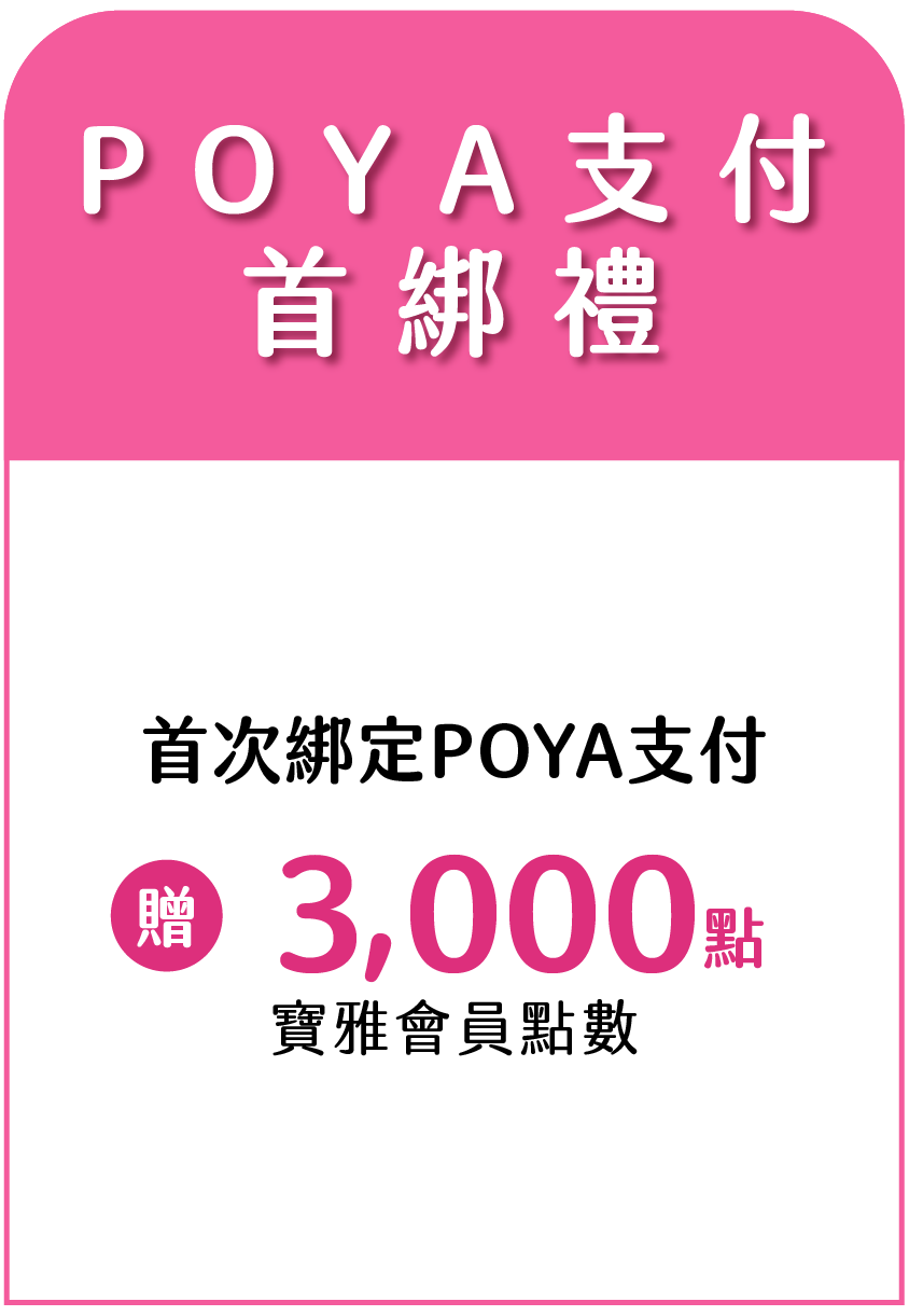 - 此優惠僅限寶雅全通路使用聯名卡綁定POYA PAY行動支付。