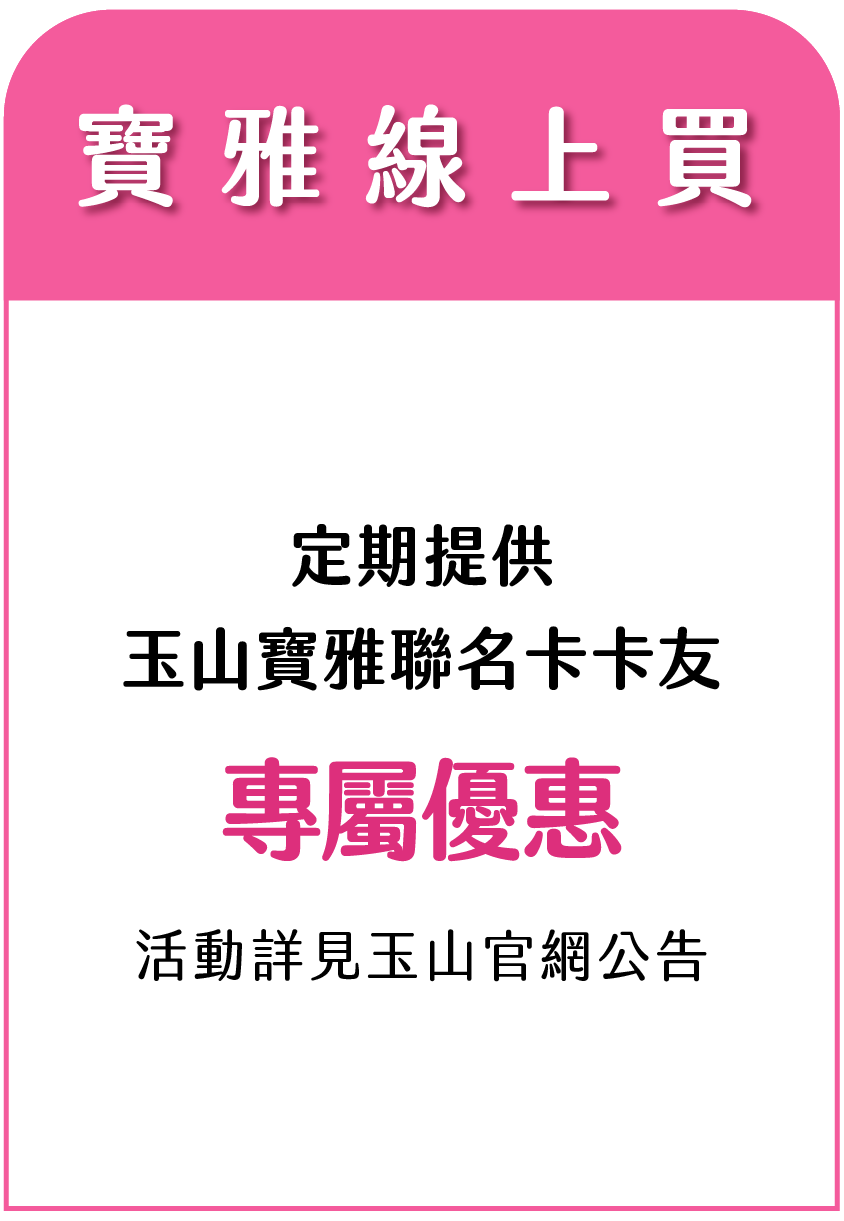 - 玉山銀行與寶雅將定期提供寶雅線上買專屬回饋,詳情請見玉山官網公告。