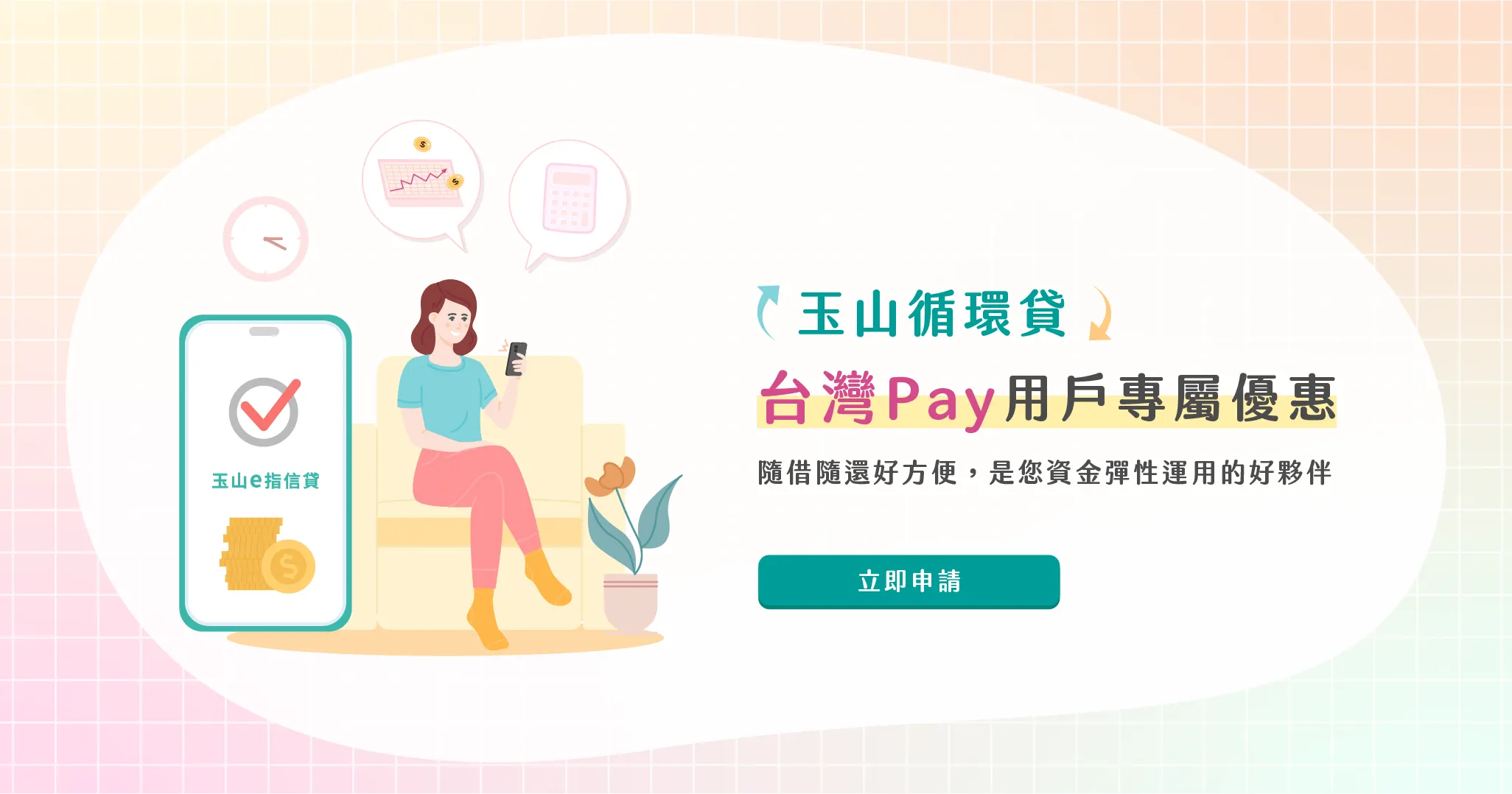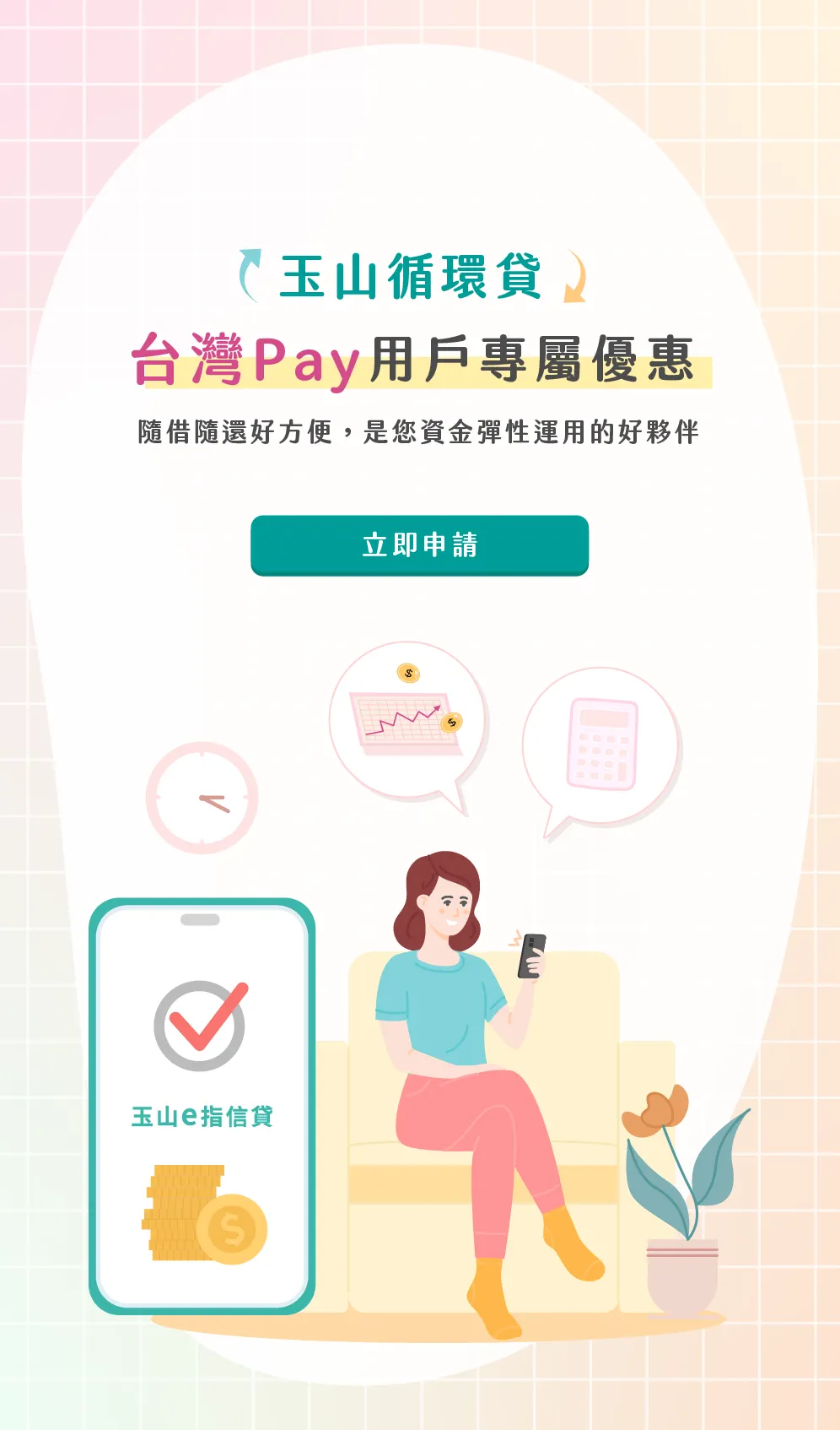 玉山循環貸,台灣PAY用戶專屬方案,貸款費用2,000元,隨借隨還好方便,是您資金彈性運用的好夥伴。